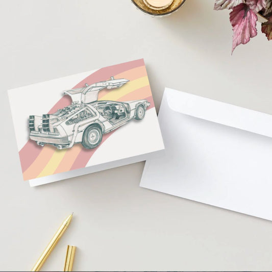 This original 5"×7" greeting card from Retro Sweet celebrates one of the most iconic movie machines of all time with a clean, modern Retro Sweet twist. The front features a sketch-style illustration of the DeLorean time machine, gull‑wing doors open, details crisp and unmistakably nostalgic, set against a bold retro...